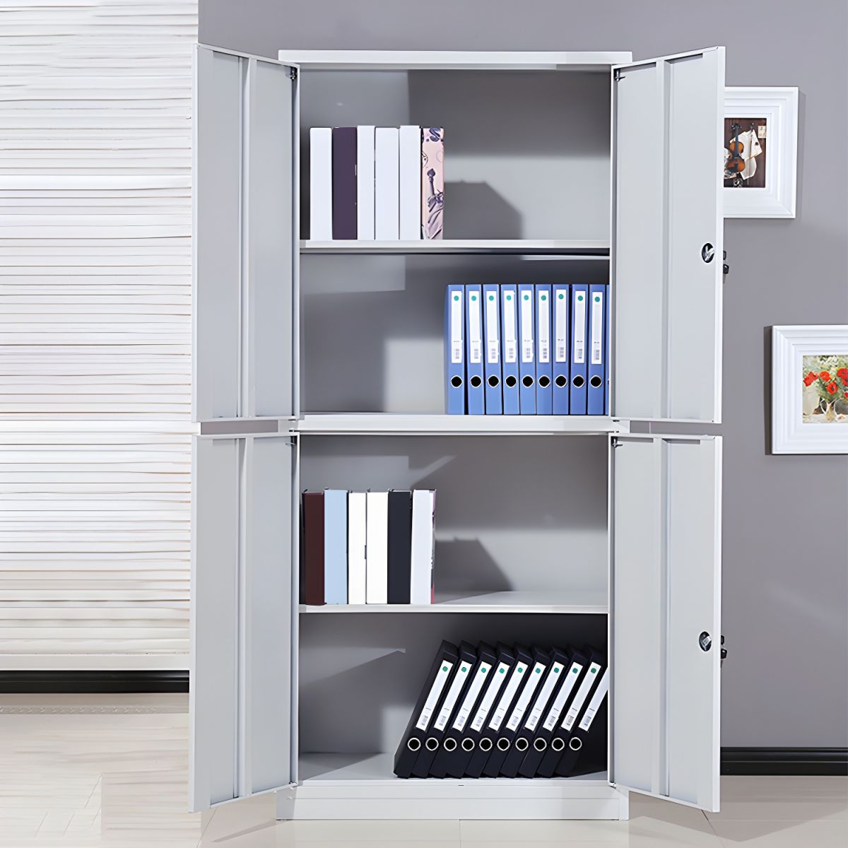 This 4-door office filing cabinet Is Made Of High-Quality Steel, Making It Durable As Well As Easy To Clean, Assembly Is Easy, Feature a Durable Powder-Coated Stove Enamel Finish And An Elegant Neutral Grey.
